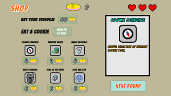 Fight on the deadly arena to earn your freedom. The longer you stay, the greater the risk of failure but... if you wish, you may risk your life by facing deadlier traps and enemies for more cookies or you can take your chance and collect cookies slowly — but be prepared, because the Biscuitmen will not be generous if the show is boring - moreover they will unleash additional traps and enemies as your struggle continues.